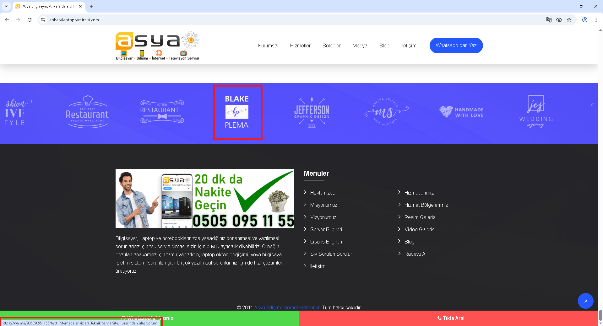 Karşılaşılan: Ankara Laptop Tamircisi websitesinin anasayfasında yer alan markaların logolarına tıklandığında, whatsapp iletişim sayfası açılmaktadır. Kullanıcı deneyimi açısından olumsuzluk oluşturmaktadır.